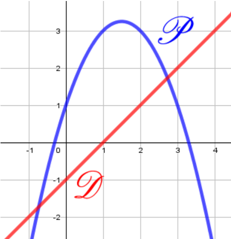 On a tracé la parabole $\mathscr{P}$ représentant la fonction $f$ définie sur $\mathbb{R}$ par $f(x) =-x^2+3x+1$ et la droite $\mathscr{D}$ d'équation $y= x-1$.